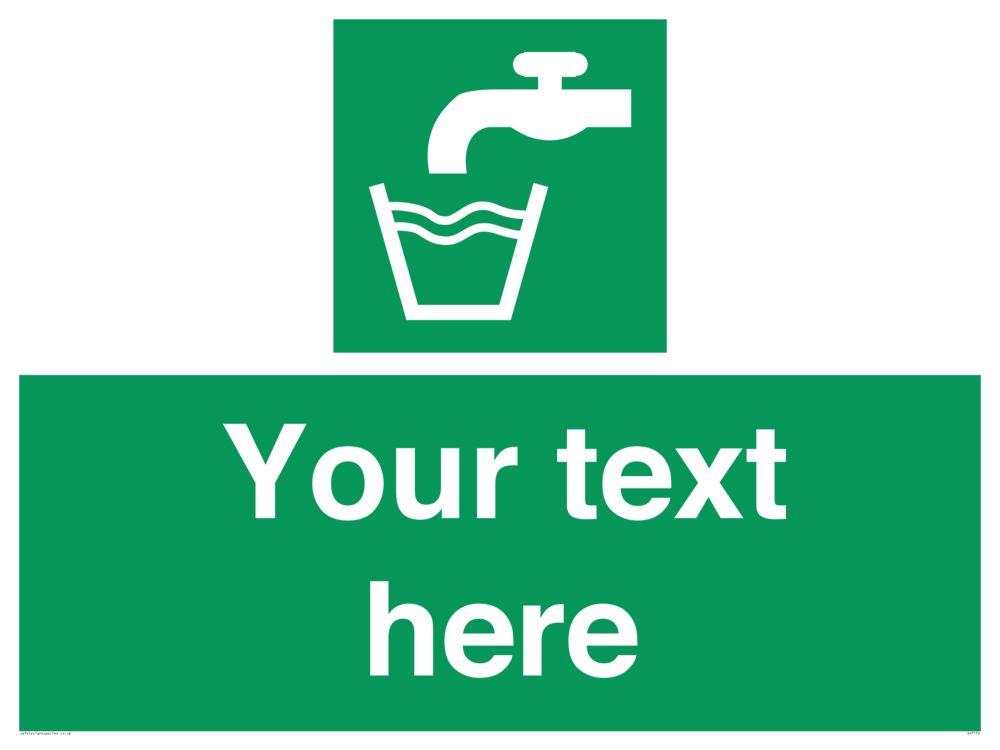 This sign contains a drinking water symbol - tap with water flowing into cup in white on green background.