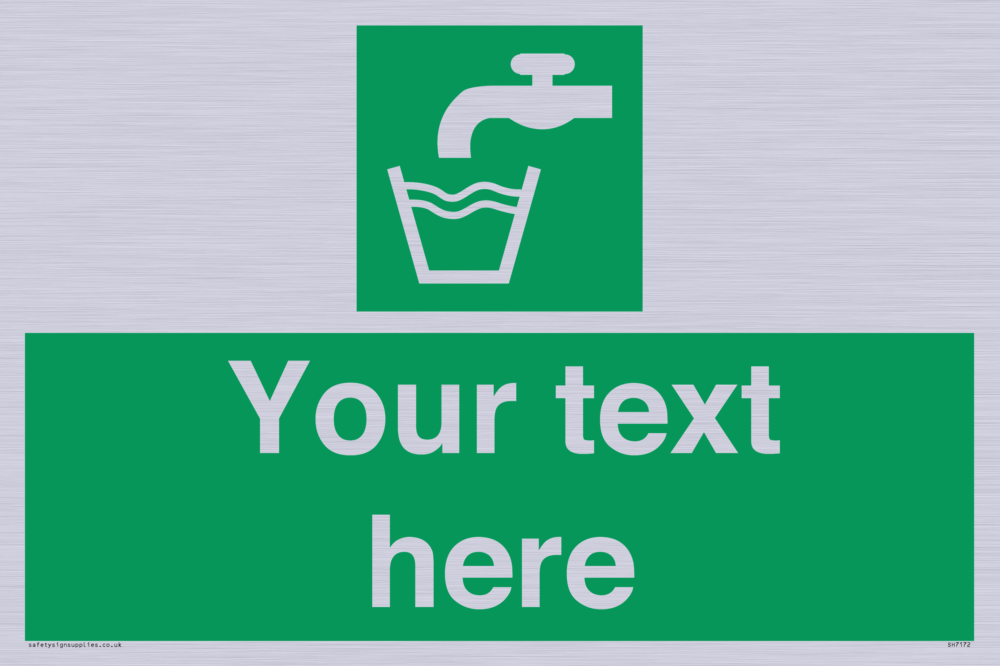 This sign contains a drinking water symbol - tap with water flowing into cup in white on green background.