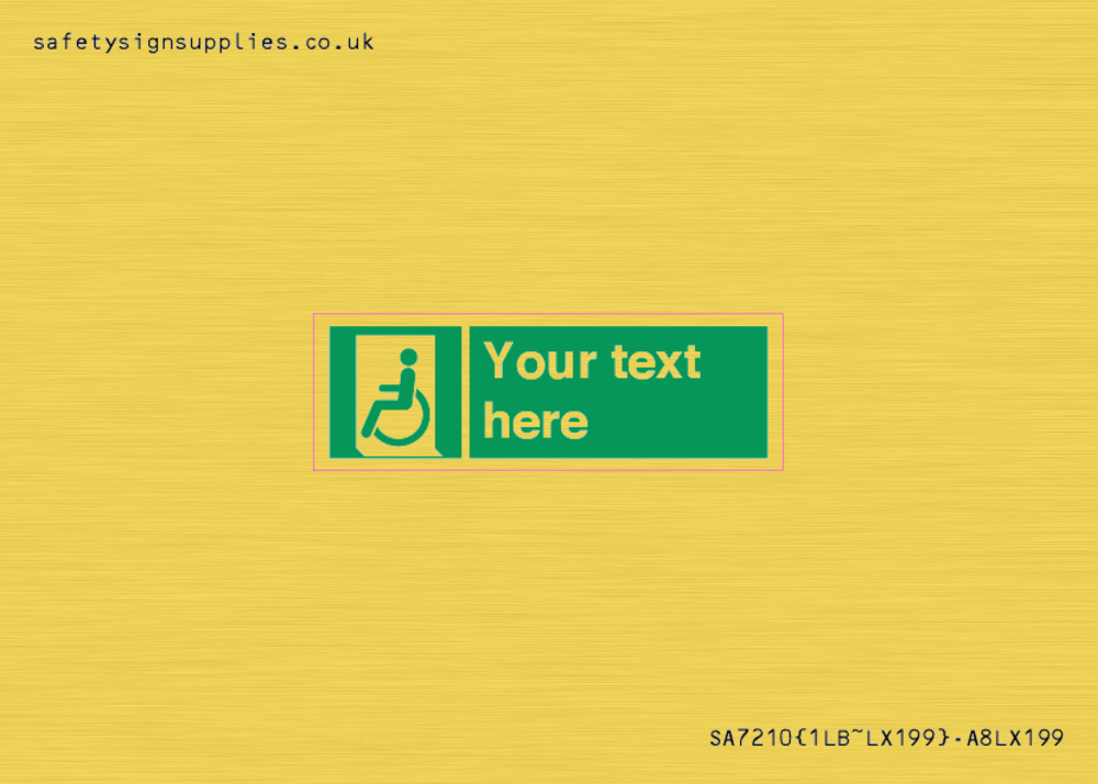 Durability: 3-5 years Mounting Surface: door Materials: Sticker Material Colour: Gold Custom Text: Yes Language: ENGLISH Language (EN) Symbol: E026 : Emergency exit for people unable to walk or with walking impairment (left) Internal Layout: 1LB : 1 letterbox pod in a Letterbox Cut Configuration: 30x10mm Rectangle(s) Region: UK