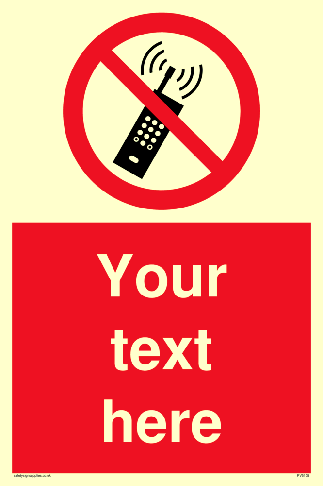 This sign contains a no mobile phones symbol, black mobile phone with red prohibition circle with diagonal line crossed through.