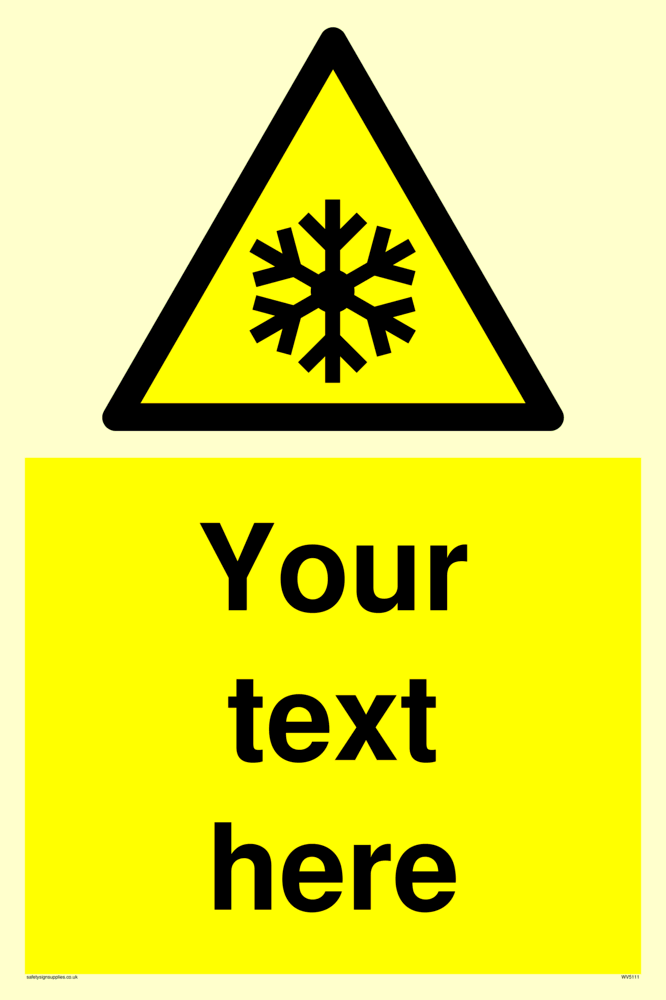 This signs contains a low temperature warning symbol. Snowflake symbol in black