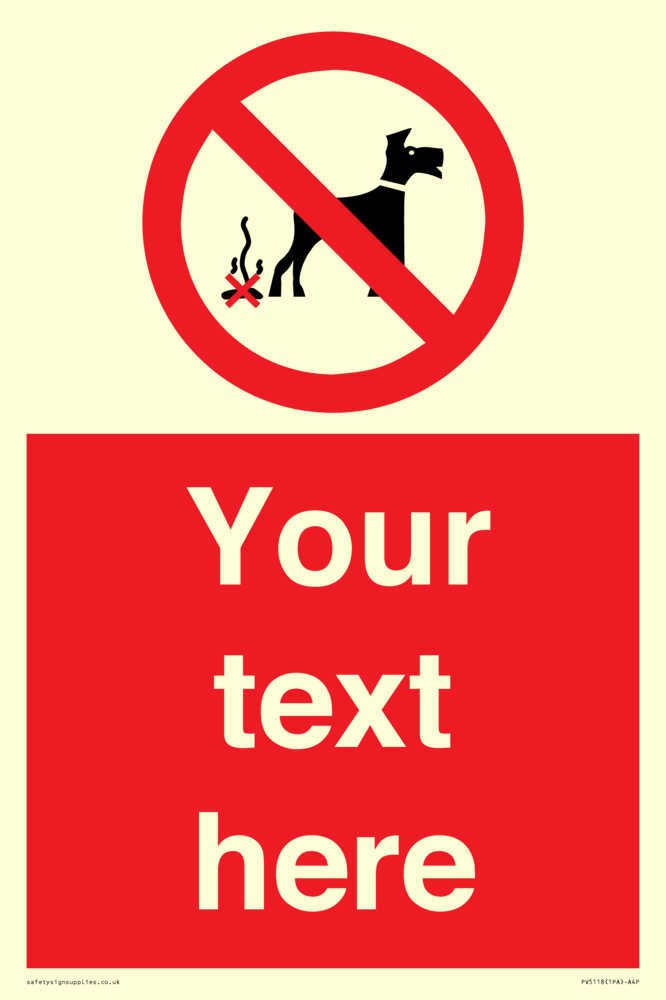 Custom No Dog Fouling Sign. Add your own custom text. Normal delivery times apply. Red No Dog Fouling Symbol. This symbol and sign layout complies with new EN7010 legislation that governs safety signs.