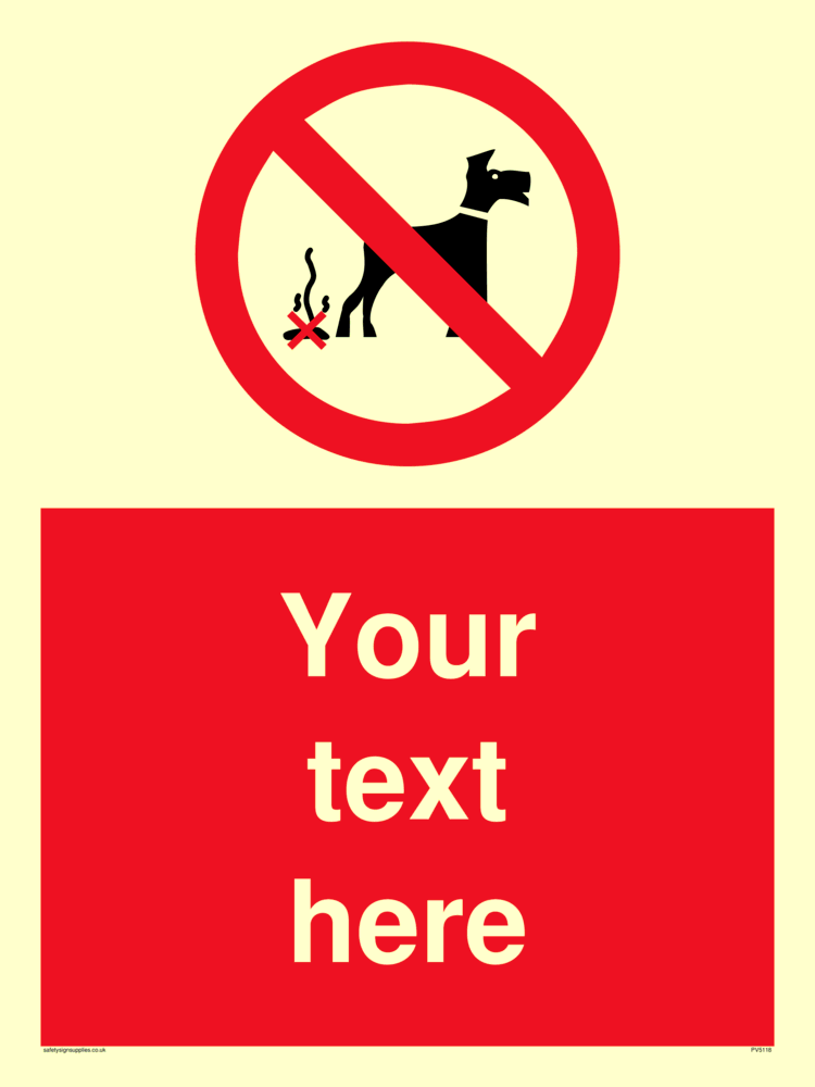 Custom No Dog Fouling Sign. Add your own custom text. Normal delivery times apply. Red No Dog Fouling Symbol. This symbol and sign layout complies with new EN7010 legislation that governs safety signs.