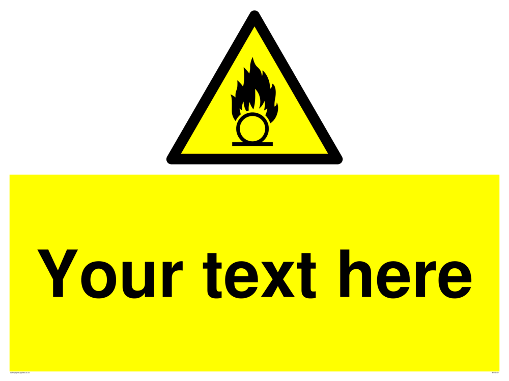 This sign contains an international standard oxidising warning symbol. Flat bar and circle with flames in black in yellow warning triangle with black border.