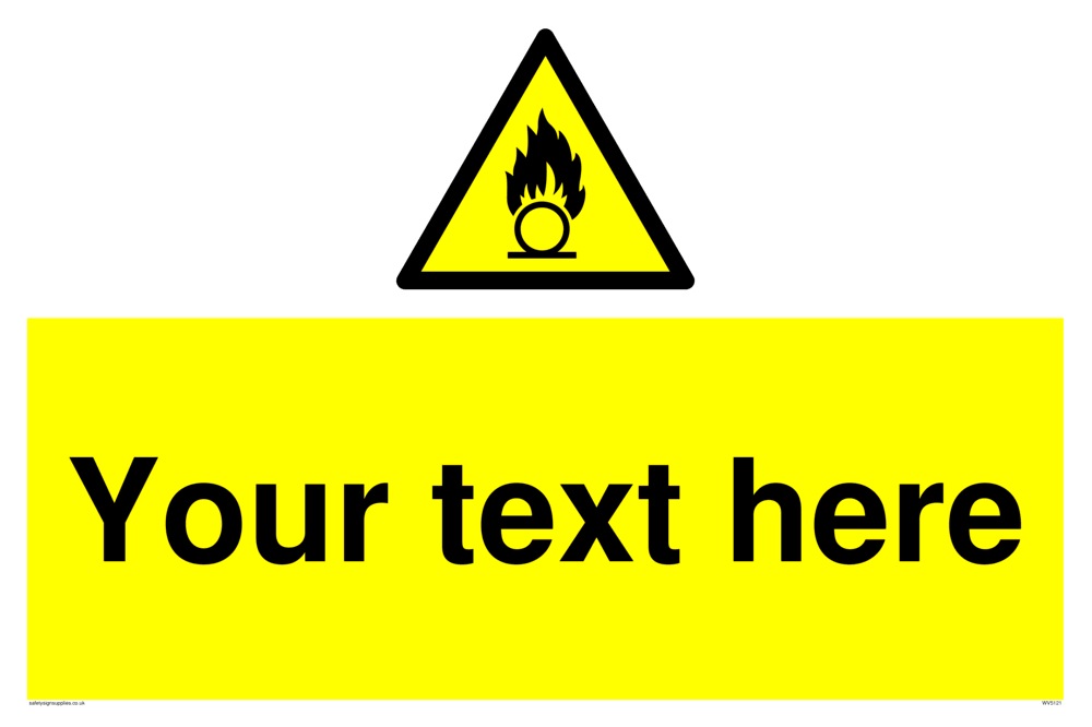 This sign contains an international standard oxidising warning symbol. Flat bar and circle with flames in black in yellow warning triangle with black border. Comes with a self adhesive backing. 400mm or approximately 16" high.