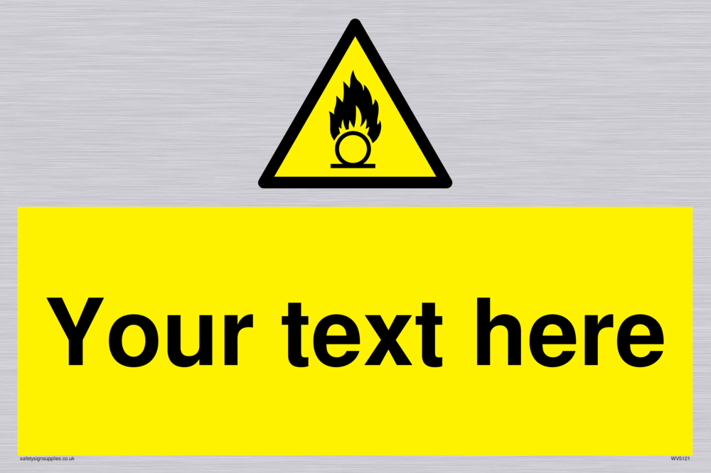 This sign contains an international standard oxidising warning symbol. Flat bar and circle with flames in black in yellow warning triangle with black border. Comes with a self adhesive backing. 200mm or approximately 8" high.