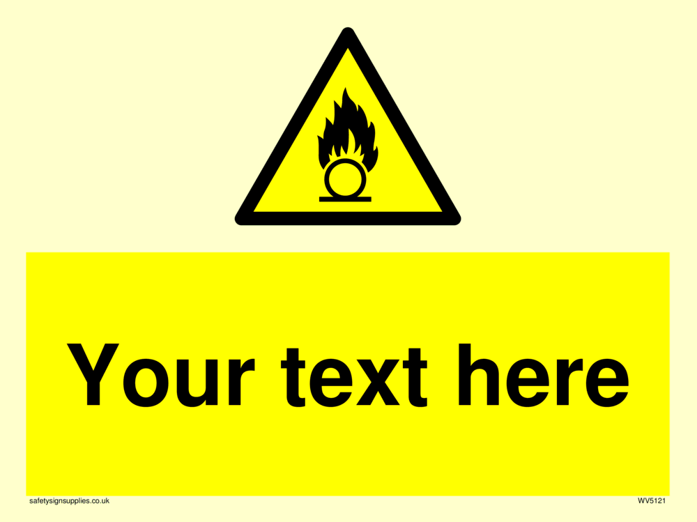 This sign contains an international standard oxidising warning symbol. Flat bar and circle with flames in black in yellow warning triangle with black border.