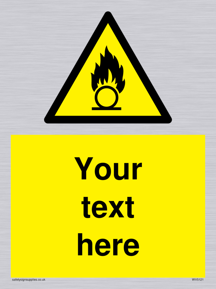 This sign contains an international standard oxidising warning symbol. Flat bar and circle with flames in black in yellow warning triangle with black border. Suitable for fixing with screws. Suitable for hanging with a premium hanging kit.