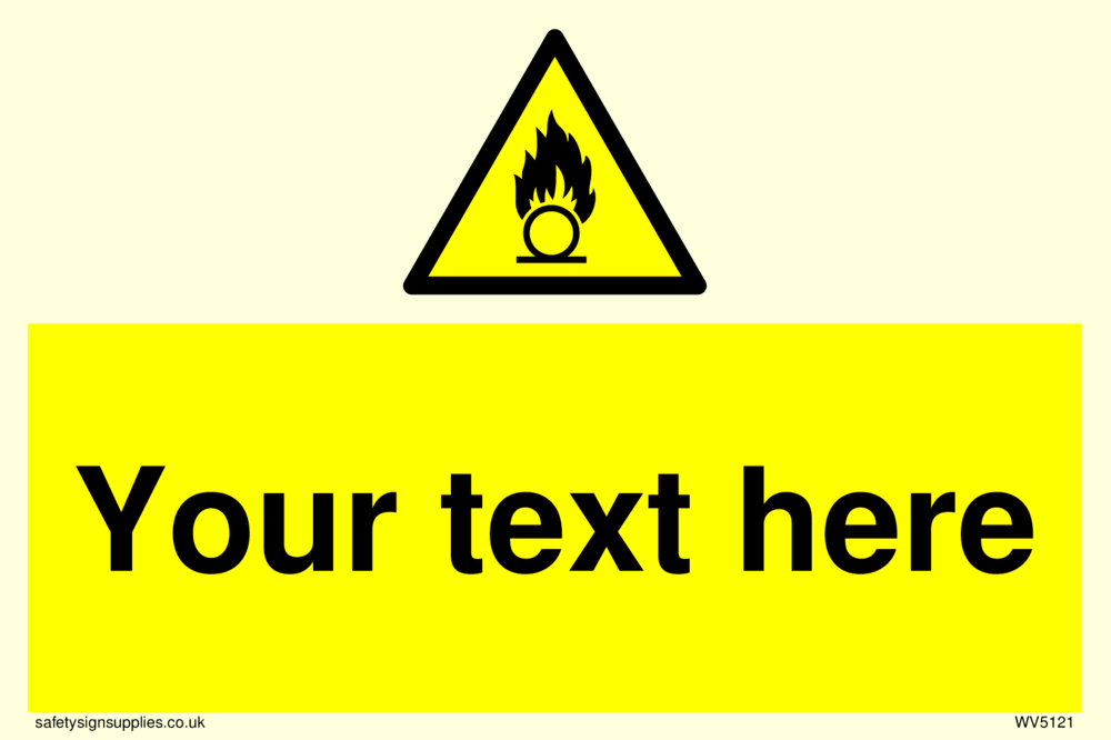 This sign contains an international standard oxidising warning symbol. Flat bar and circle with flames in black in yellow warning triangle with black border. Comes with a self adhesive backing. 100mm or approximately 4" high.