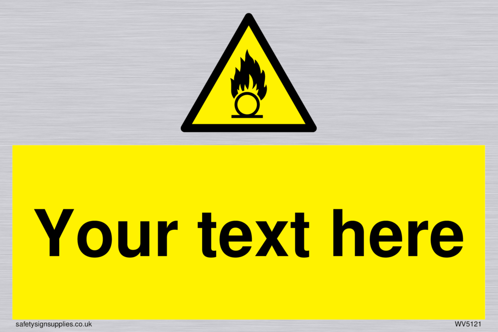 This sign contains an international standard oxidising warning symbol. Flat bar and circle with flames in black in yellow warning triangle with black border. Comes with a self adhesive backing. 100mm or approximately 4" high.