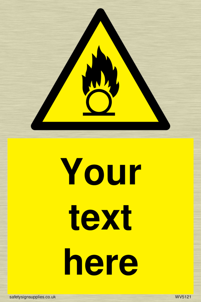 This sign contains an international standard oxidising warning symbol. Flat bar and circle with flames in black in yellow warning triangle with black border. Suitable for fixing with screws. Suitable for hanging with a premium hanging kit.