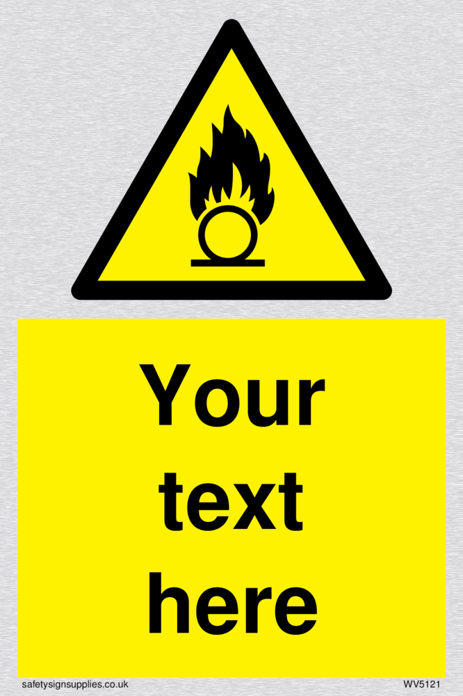 This sign contains an international standard oxidising warning symbol. Flat bar and circle with flames in black in yellow warning triangle with black border. Suitable for fixing with screws. Suitable for hanging with a premium hanging kit.