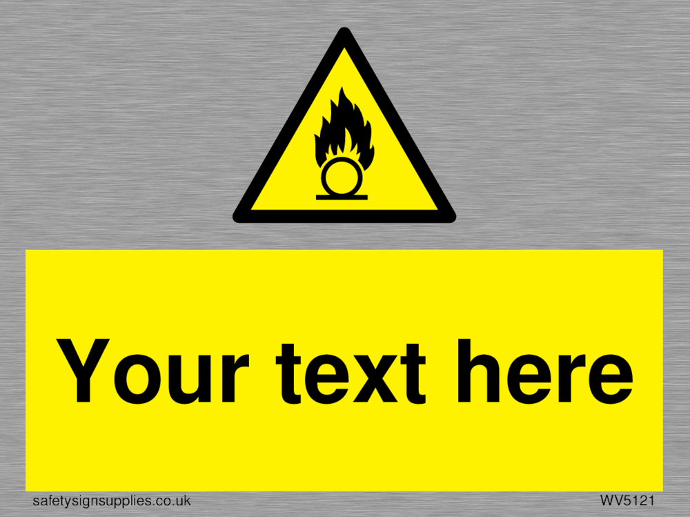 This sign contains an international standard oxidising warning symbol. Flat bar and circle with flames in black in yellow warning triangle with black border. Suitable for fixing with screws. Suitable for hanging with a premium hanging kit.