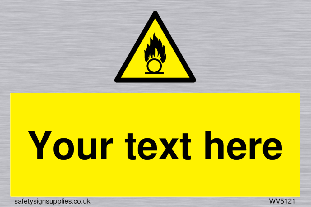 This sign contains an international standard oxidising warning symbol. Flat bar and circle with flames in black in yellow warning triangle with black border. Suitable for fixing with screws. Suitable for hanging with a premium hanging kit.