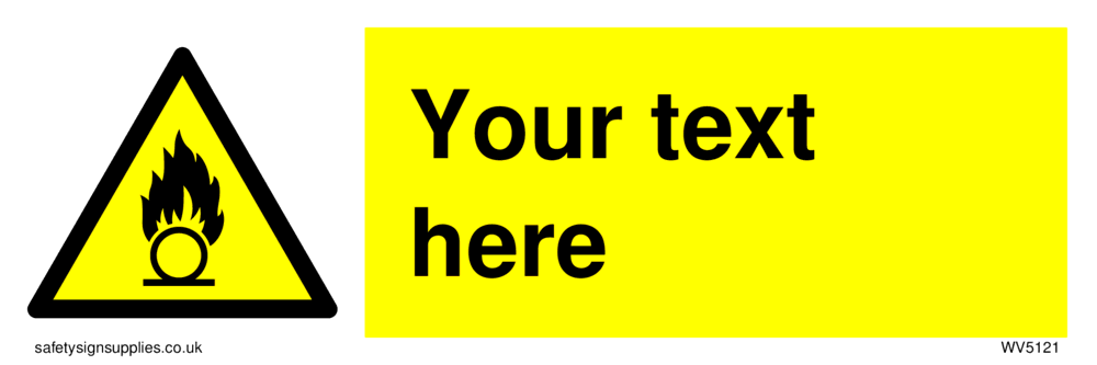 This sign contains an international standard oxidising warning symbol. Flat bar and circle with flames in black in yellow warning triangle with black border. Comes with a self adhesive backing. 50mm or approximately 2" high