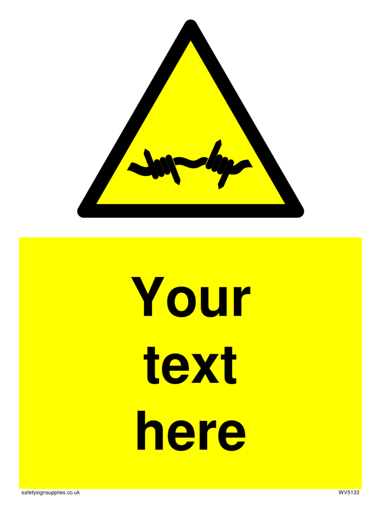 This sign contains a barbed wire warning symbol. Barbed wire in black on a yellow warning triangle with a black border.