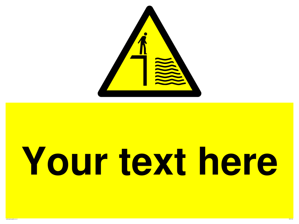 This sign contains a deep water warning symbol. Person standing next to drop into deep water in black on yellow warning triangle with black border.