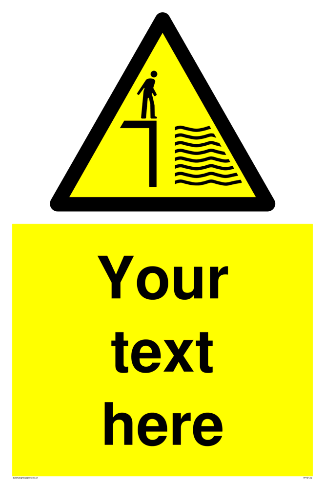 This sign contains a deep water warning symbol. Person standing next to drop into deep water in black on yellow warning triangle with black border.