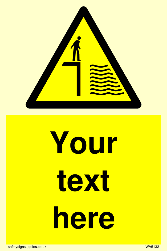 This sign contains a deep water warning symbol. Person standing next to drop into deep water in black on yellow warning triangle with black border.