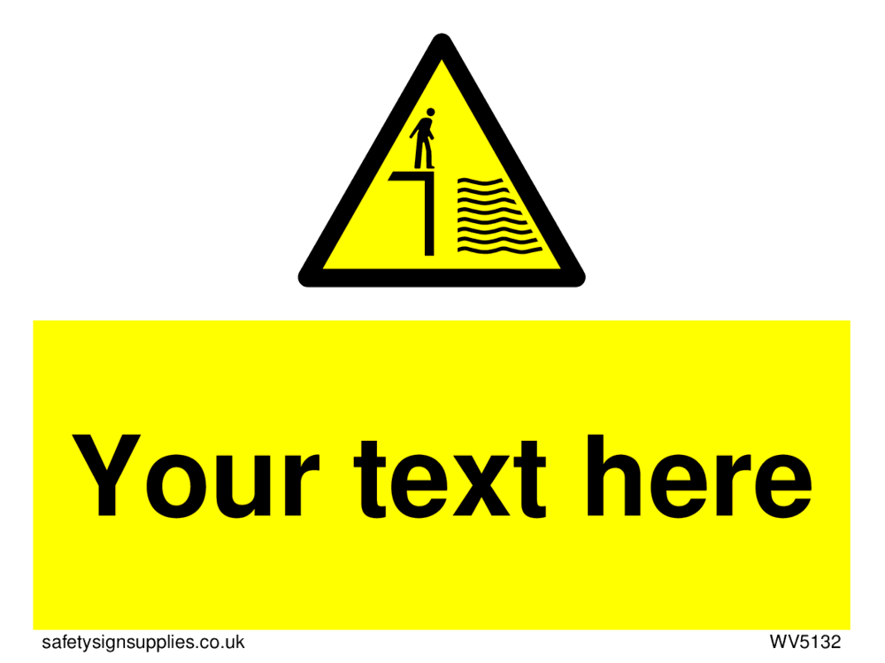 This sign contains a deep water warning symbol. Person standing next to drop into deep water in black on yellow warning triangle with black border.