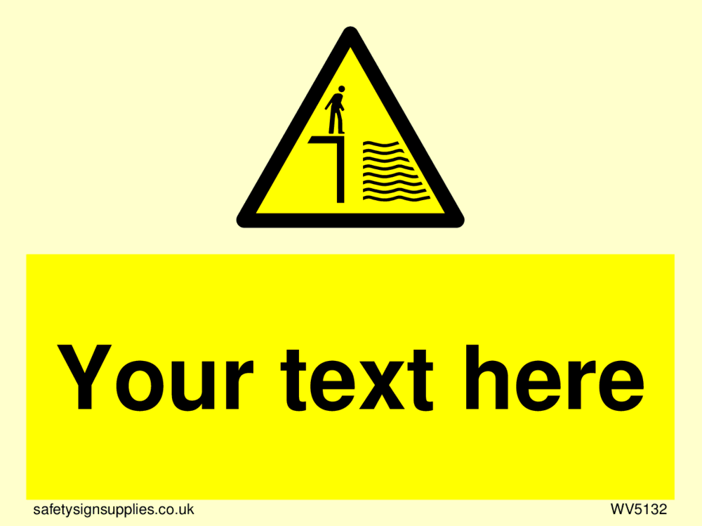 This sign contains a deep water warning symbol. Person standing next to drop into deep water in black on yellow warning triangle with black border.