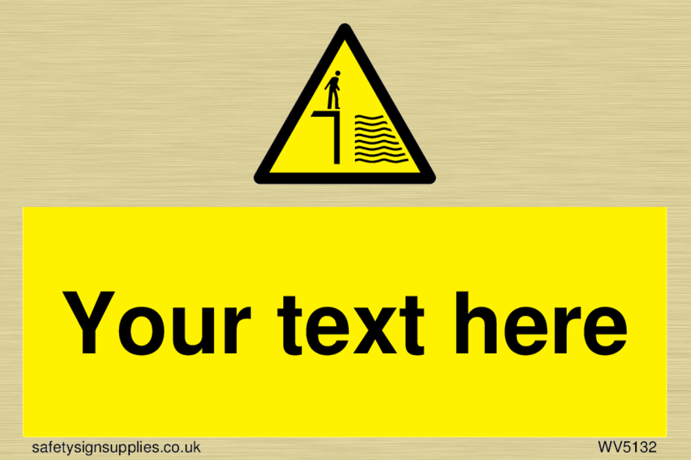 This sign contains a deep water warning symbol. Person standing next to drop into deep water in black on yellow warning triangle with black border.