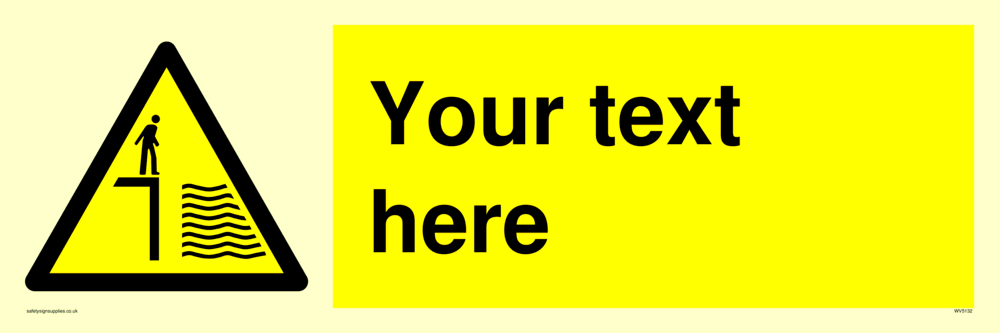 This sign contains a deep water warning symbol. Person standing next to drop into deep water in black on yellow warning triangle with black border.