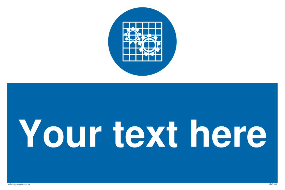 This sign contains a machine guards required symbol - wheels / cogs behind guard in white within blue circle.