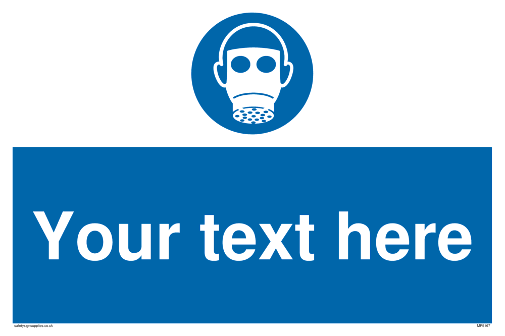 This sign contains a respirator required symbol - person wearing respirator in white within blue circle.