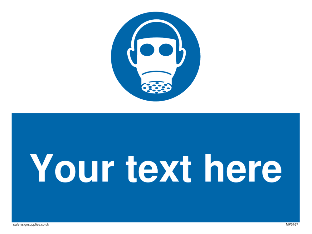 This sign contains a respirator required symbol - person wearing respirator in white within blue circle.