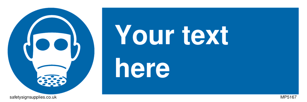 This sign contains a respirator required symbol - person wearing respirator in white within blue circle.