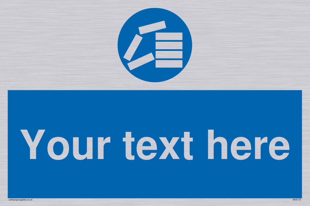 Suitable for mounting on a smooth surface Suitable for fixing to a suspended ceiling. Suitable for mounting on an uneven surface Suitable for perpendicular installation Custom signs contain the text required by the customer. With your your text and a standard safety sign symbol - a bespoke sign can fit any requirement.