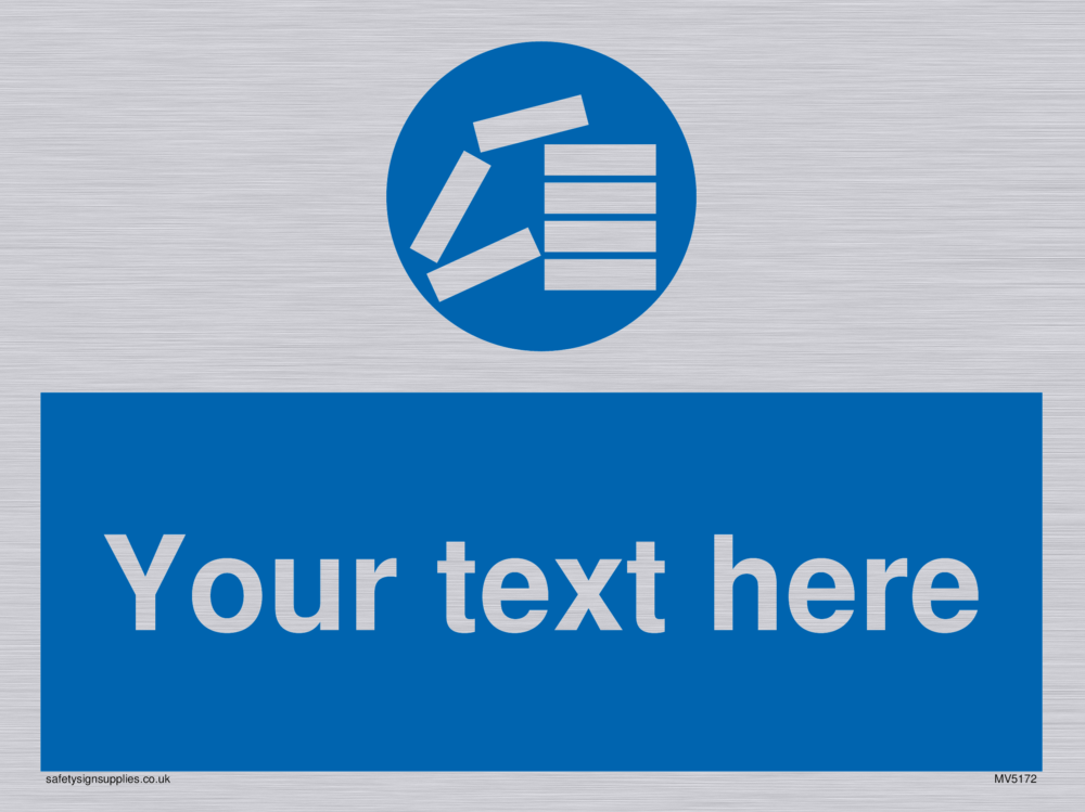 Suitable for mounting on a smooth surface Suitable for fixing to a suspended ceiling. Suitable for mounting on an uneven surface Suitable for perpendicular installation Custom signs contain the text required by the customer. With your your text and a standard safety sign symbol - a bespoke sign can fit any requirement.