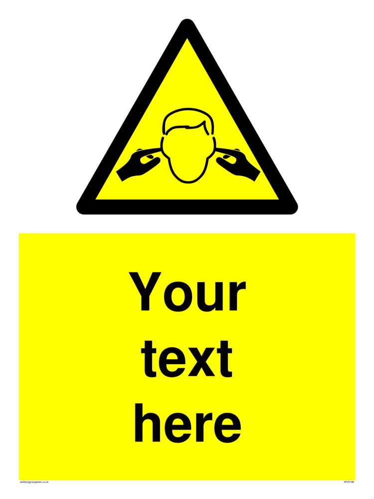 This sign contains a standard noise hazard symbol. Person with fingers in their ears in black on yellow warning triangle with black border.