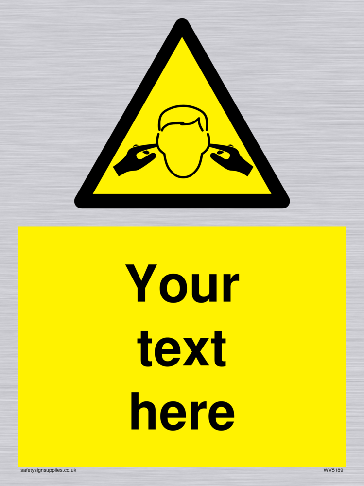 This sign contains a standard noise hazard symbol. Person with fingers in their ears in black on yellow warning triangle with black border.