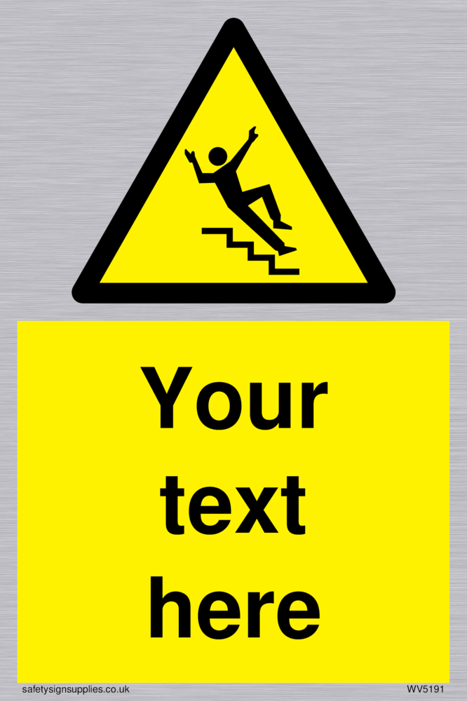 This sign contains a slippery stairs warning symbol. Person slipping on stairs in black in yellow warning triangle with black border. Suitable for fixing with screws. Suitable for hanging with a premium hanging kit.