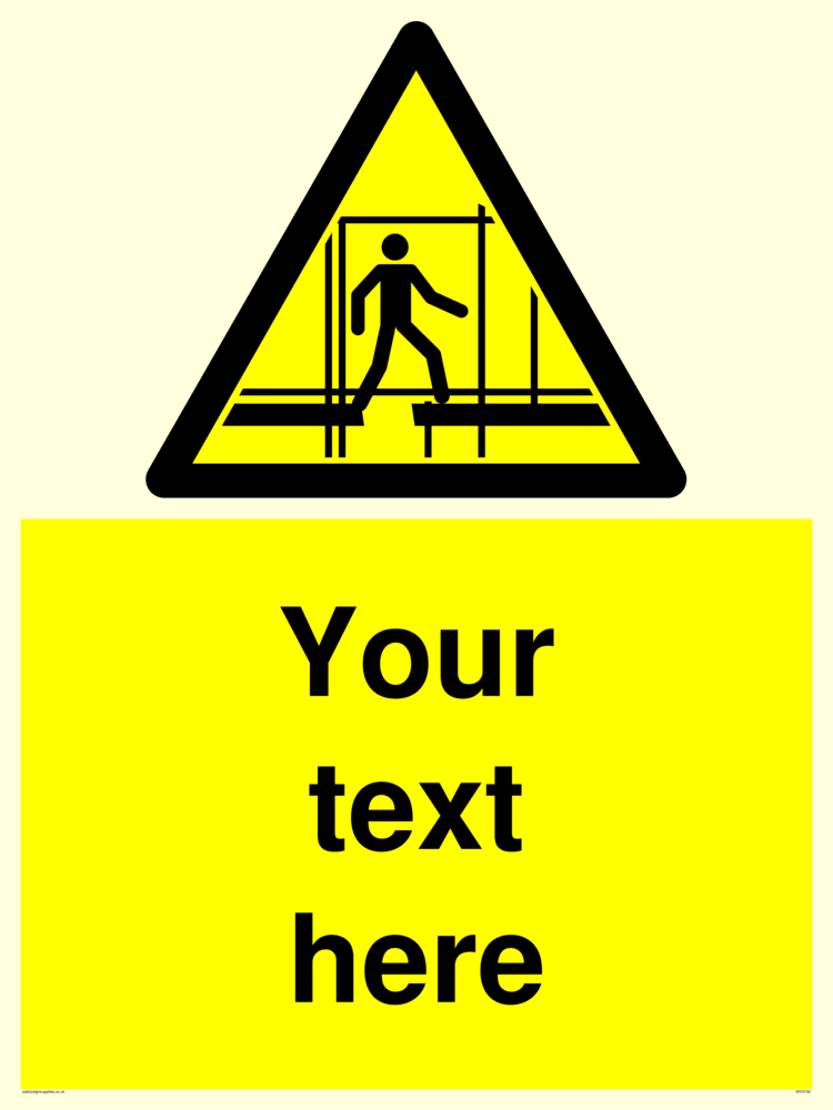 This sign contains scaffolding warning symbol - outline of a man on incomplete scaffolding in black on a yellow warning triangle with black border. Comes with a self adhesive backing. 800mm or approximately 32" high.