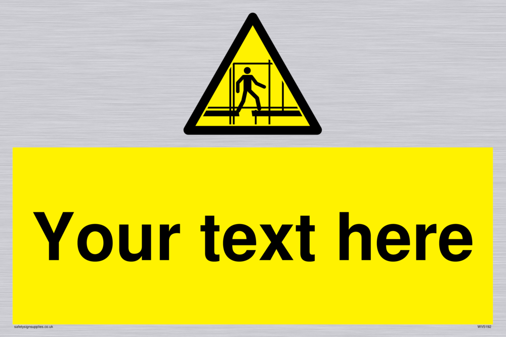 This sign contains scaffolding warning symbol - outline of a man on incomplete scaffolding in black on a yellow warning triangle with black border. Suitable for fixing with screws. Suitable for hanging with a premium hanging kit.