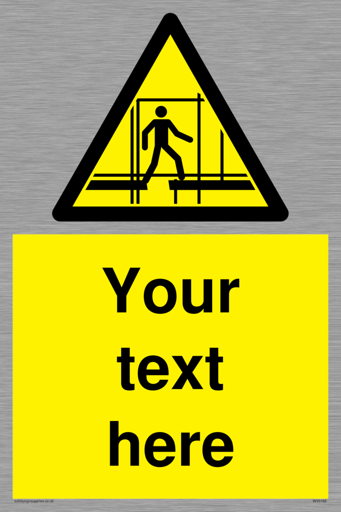 This sign contains scaffolding warning symbol - outline of a man on incomplete scaffolding in black on a yellow warning triangle with black border. Suitable for fixing with screws. Suitable for hanging with a premium hanging kit.