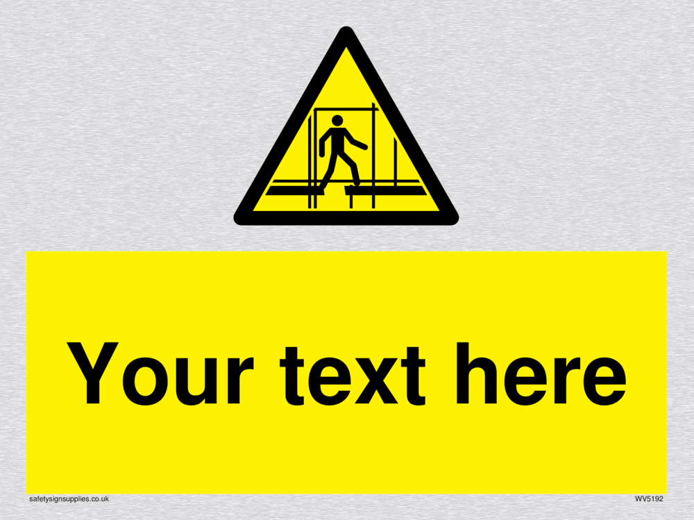 This sign contains scaffolding warning symbol - outline of a man on incomplete scaffolding in black on a yellow warning triangle with black border. Suitable for fixing with screws. Suitable for hanging with a premium hanging kit.