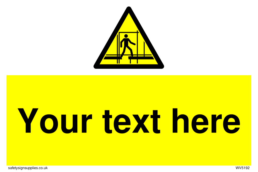 This sign contains scaffolding warning symbol - outline of a man on incomplete scaffolding in black on a yellow warning triangle with black border.