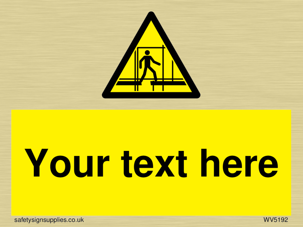 This sign contains scaffolding warning symbol - outline of a man on incomplete scaffolding in black on a yellow warning triangle with black border. Suitable for fixing with screws. Suitable for hanging with a premium hanging kit.