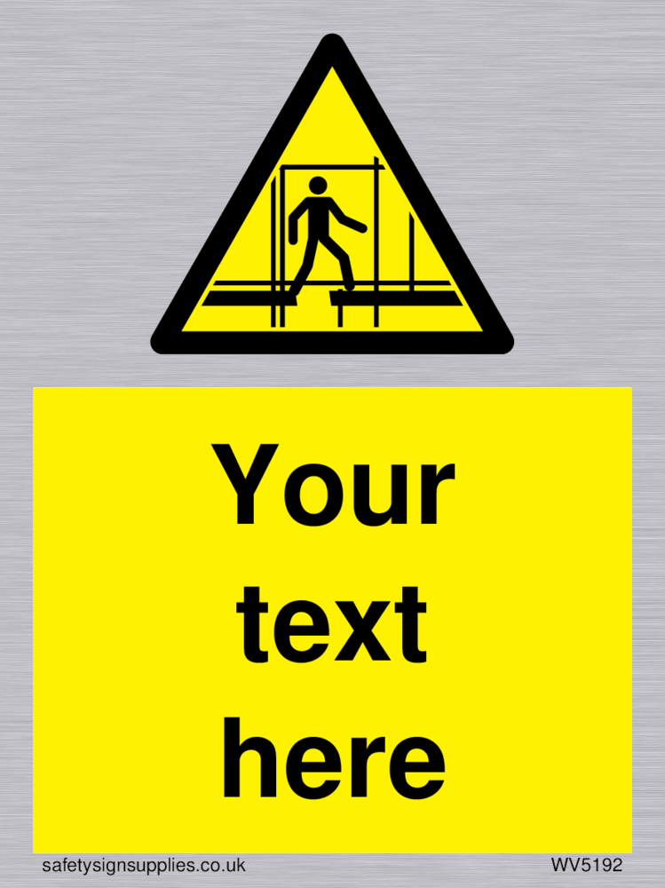 This sign contains scaffolding warning symbol - outline of a man on incomplete scaffolding in black on a yellow warning triangle with black border. Suitable for fixing with screws. Suitable for hanging with a premium hanging kit.
