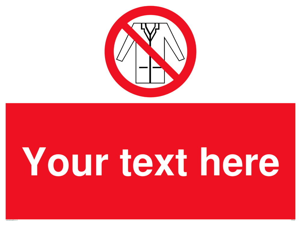 This sign contains a no lab coats symbol, lab coat outline with red prohibition circle with diagonal line crossed through.