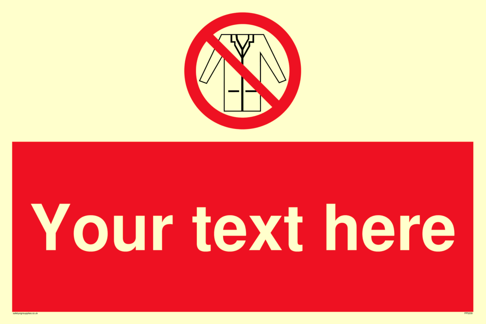 This sign contains a no lab coats symbol, lab coat outline with red prohibition circle with diagonal line crossed through.