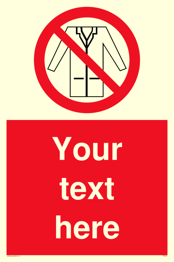 This sign contains a no lab coats symbol, lab coat outline with red prohibition circle with diagonal line crossed through.