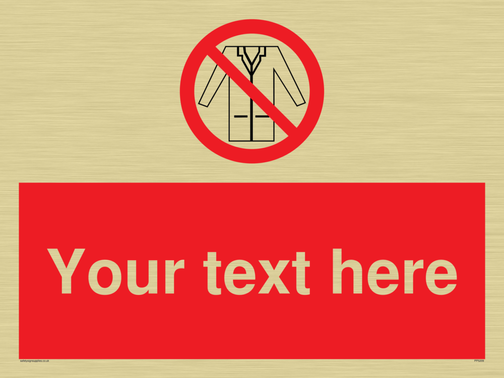 This sign contains a no lab coats symbol, lab coat outline with red prohibition circle with diagonal line crossed through.