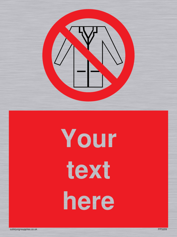 This sign contains a no lab coats symbol, lab coat outline with red prohibition circle with diagonal line crossed through.