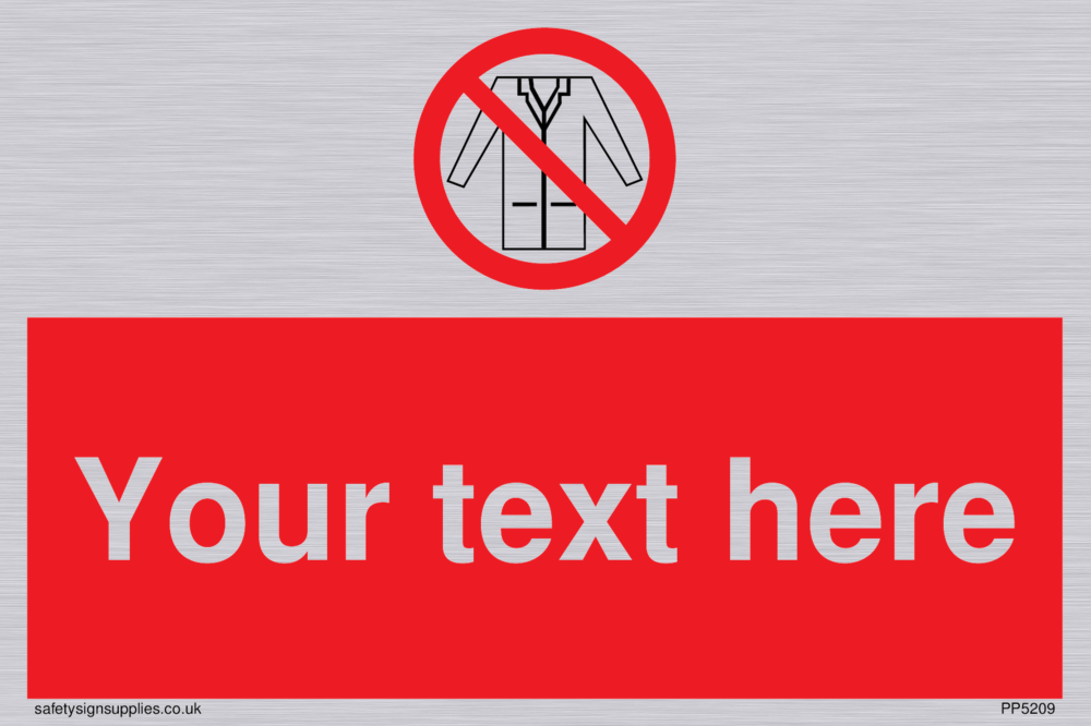 This sign contains a no lab coats symbol, lab coat outline with red prohibition circle with diagonal line crossed through.