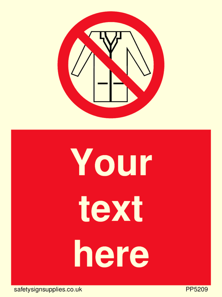 This sign contains a no lab coats symbol, lab coat outline with red prohibition circle with diagonal line crossed through.